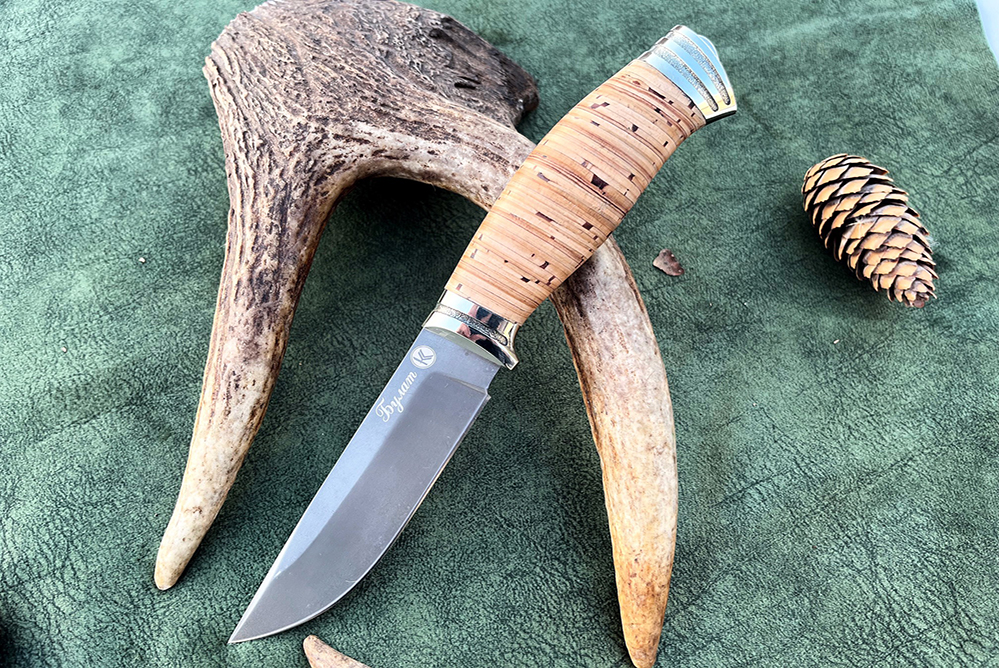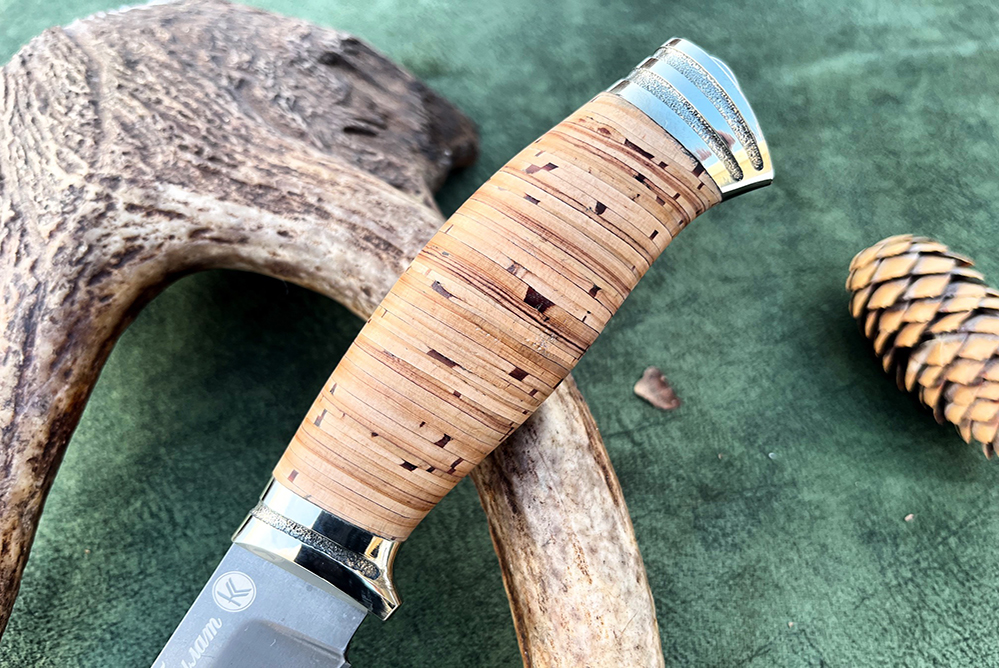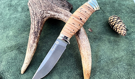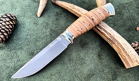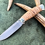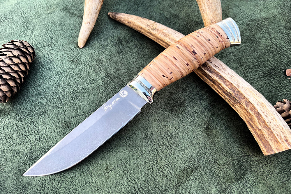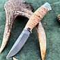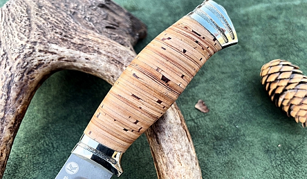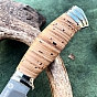 Нож "Ворон" из стали тигельный булат, рукоять береста, литье мельхиор, сквозной монтаж