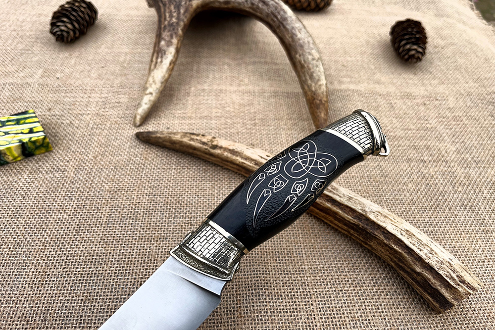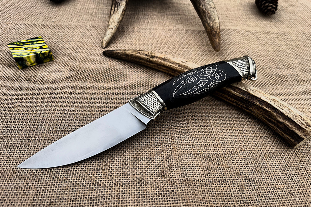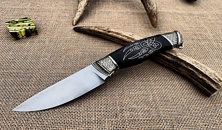 Нож "Леший" сталь м390, рукоять граб, мельхиор, инкрустация