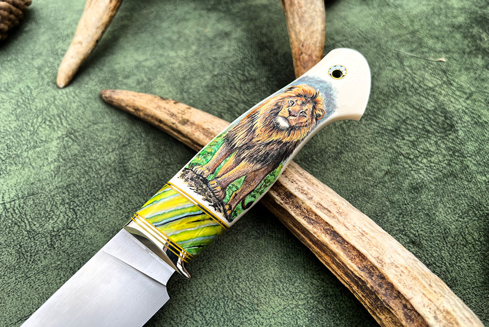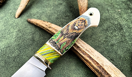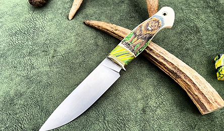 Главная » Каталог » Ножи из стали S390 » Нож "Леший" сталь s390, рукоять элфорин, вставка зуб мамонта, скримшоу