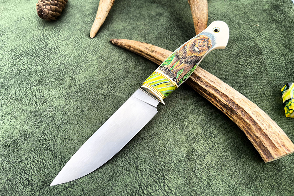 Нож "Леший" сталь s390, рукоять элфорин, вставка зуб мамонта, скримшоу