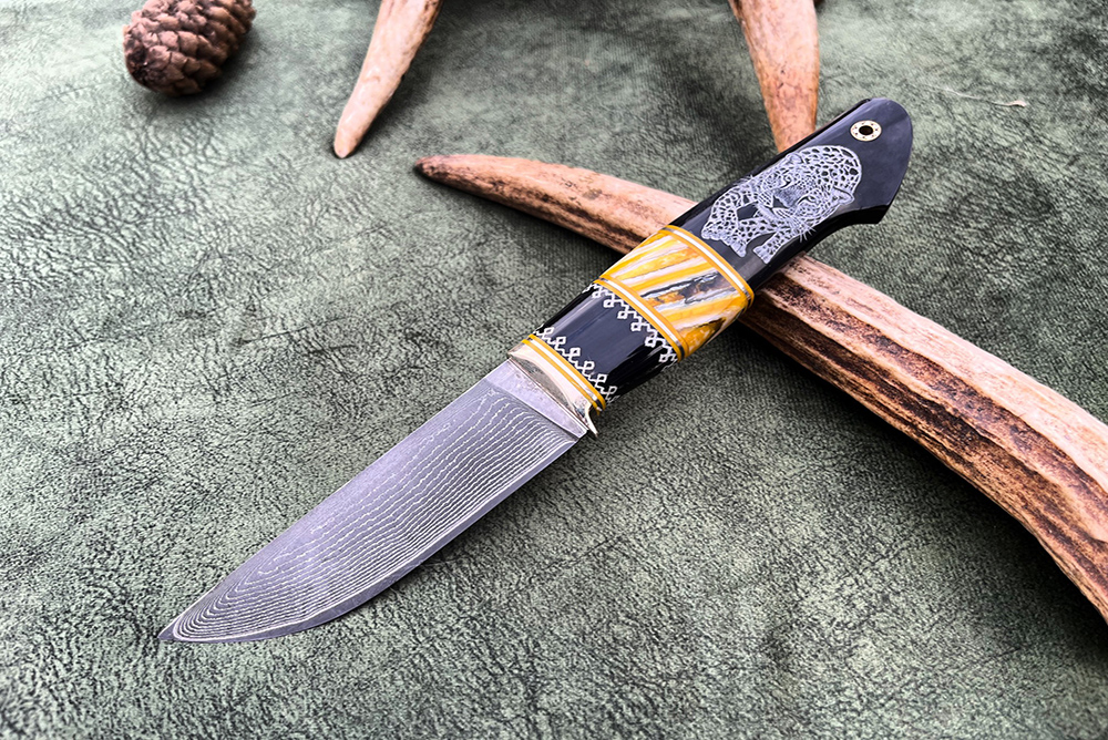 Нож "Мангуст" сталь s390, рукоять рог буйвола, зуб мамонта, скримшоу