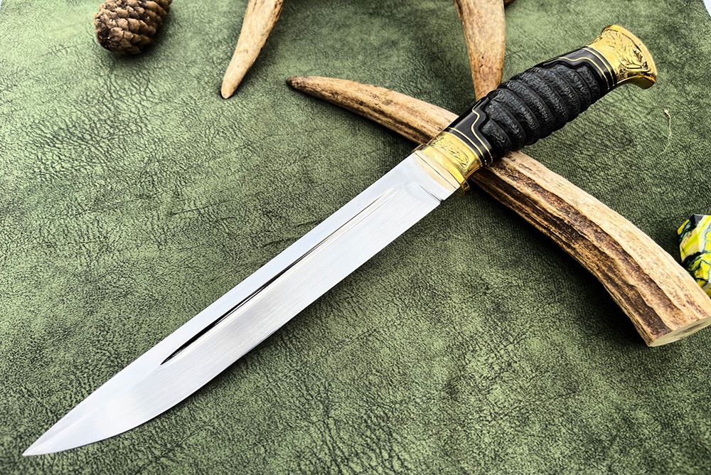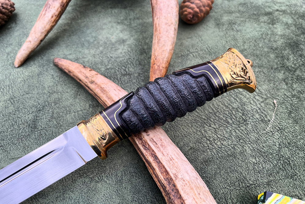 Сталь Х12МФ, рукоять граб, литье латунь, ручная резьба по дереву